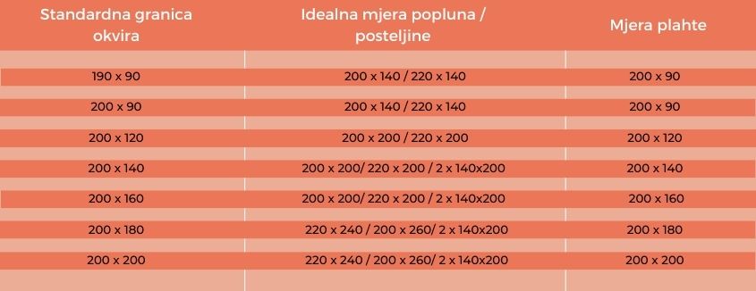 Prvo što trebate znati je prava veličina okvira kreveta i popluna, jer ćete prema tim mjerama prilagoditi veličinu svoje posteljine. Za lakše snalaženje, vodite se standardnim mjerama okvira kreveta u donjoj tablici: