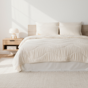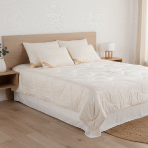 Odeja je prijazna do kože, saj je izdelana iz naravnih, hipoalergenih materialov, ki ne dražijo in omogočajo nežno ter udobno spalno izkušnjo.